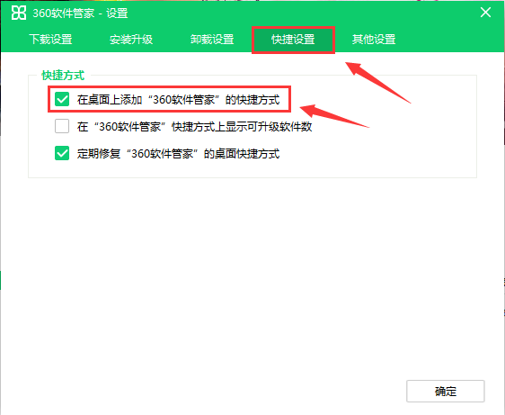 点击【快捷设置】,在快捷方式里面勾选(在桌面上添加“360软件管家”的快捷方式),然后点击底部的确定即可。