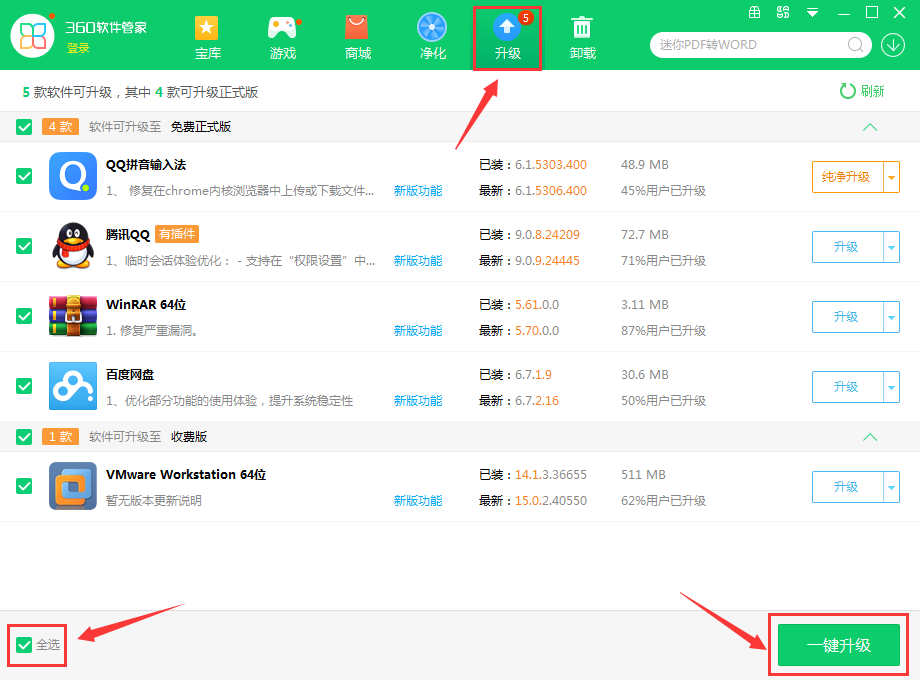 然后,点击底部左下角的【全选】,再点击点击底部右下角的【一键升级】即可。